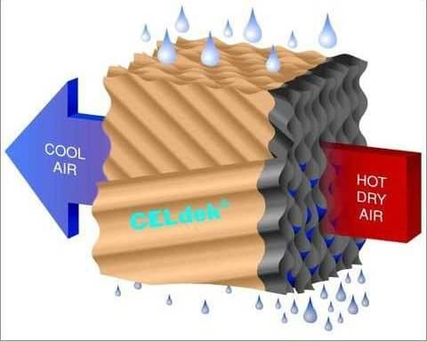 Dla większych obiektów z wentylacją tunelową proponujemy system pad-cooling, znany również jako system chłodzenia ewaporacyjnego. W tym rozwiązaniu chłodzenie odbywa się poprzez specjalne panele wykonane z nasączonych wodą warstw falistego papieru celulozowego. Ciepłe powietrze z zewnątrz przechodzi przez te panele, gdzie parowanie wody obniża temperaturę powietrza nawet o 10°C.